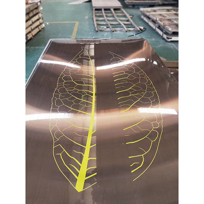 刻印されたパターンは,指定された領域に保護性酸耐性フィルムを選択的に塗り,保護されていない領域に酸で刻印することで作成されます.色を鈍い銀灰色に変える表面を磨き,スーパーミラー,または他の仕上げと対照化して数千の変形を作成することができます.飾り付けに使われていたエレベーターのドアや壁パネルや コッピングやトリミングなどです